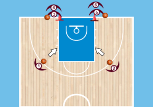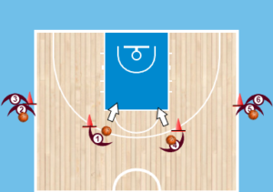 Επίπεδο 1:Toποθετούμε περίπου για αρχή σαν παράδειγμα 6 παίκτες στο μισό γήπεδο κάτω απο το καλάθι στα blind spots(base line).Αν έχουμε αρχάρια παιδιά καλό είναι να βάλουμε κώνους όπως στο σχήμα.Στην συνέχεια οι 2 πρώτοι απο κάθε πλευρά έχουν μπάλα.Θέλουμε να πετάξουν την μπάλα(ΑΥΤΟΠΑΣΑ) προς το τρίποντο.Μετά να τρέξουν να πιάσουν την μπάλα και κατευθείαν να εκτελέσουν σούτ.Αρχικά το κάνουμε με δίποντα κοντινά και μετά όσο προχωράει η άσκηση το πάμε όλο και πιό μακριά το Σούτ.Σαν στόχο έχουμε να βάλουμε 10 εύστοχα σούτ σε 2 λεπτά.Αν είναι αρχάριοι το προσαρμόζουμε το ίδιο αν είναι και προχωρημένοι.Στο τρίποντο όταν το πάμε ζητάμε π.χ 5 εύστοχα τρίποντα σε 2 λεπτά και αναπροσαρμογή.