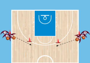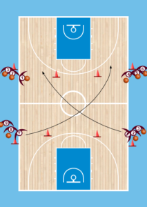 Για πιο προχωρημένους είτε περισσότερους παίκτες τους δίνουμε σε όλους μπάλες και ζητάμε αρχικά να πραγματοποιήσουν το ίδιο στο ένα μισό και μετά να πάνε πίσω στην θέση τους και να κάνουν την ίδια άσκηση και στο άλλο καλάθι απο την ίδια θέση.