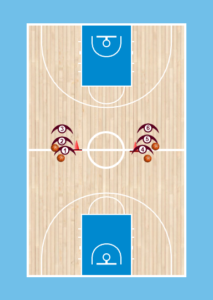 Επίπεδο 2: Tοποθετούμε τους παίκτες στο κέντρο του γηπέδου(όπως στο σχήμα πάνω) και εκτελούν την ίδια άσκηση με την διαφορά τώρα οτι εστιαζόμαστε στο σούτ με πρόσωπο απο την αρχή ώς το τέλος στο καλάθι.Εδώ τσεκάρουμε κυρίως τον ρυθμό και το πίασιμο της μπάλας πρίν την εκτέλεση και το πόσο γρήγορα εκτελεί ο παίκτης το σούτ.Αμα είναι αργό ζητάμε πιο γρήγορα το σούτ και επιμένουμε στο πάτημα STRIDE STOP(1-2).