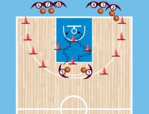 Ζητάμε οι παίκτες Νο.1 Νο.2 Νο.3 και Νο.4 να κινηθούν μόνο αρχικά με το αριστερό χέρι ντρίμπλα σλάλομ ανάμεσα στους κώνους στην περιφέρεια και να πάνε στον 1ο κώνο πάνω πάνω όπως στο σχήμα Νο.2!Το ίδιο ζητάμε απο τους παίκτες της αντίθετης πλευράς Νο.5 Νο.6 Νο.7 Νο.8 αλλα με το δεξί χέρι.Οταν φτάσουν στον πρώτο κώνο θέμε να κάνουν μιά τρίπλα σταυρωτή και να κινηθούν οί π.χ (1,2,3,4) παίκτες δεξιόστροφα ενώ οι απο την αντίθετοι πλευρά παίκτες αριστερόστροφα.Εξηγούμε καθαρά οτι ή άσκηςη είναι αφού περάσεις τους αρχικούς κώνους της περιφέρειας να κινηθείς στους τρείς απο τους τέσσερις κώνους.Δηλαδή θα πάς στον πάνω κώνο όπως στο σχήμα πρώτα, θα κάνεις σταυρωτή προς τον κώνο της μεριάς σου και μετά σταυρωτή πάλι προς τον κώνο κάτω απο το καλάθι και λέι άπ.Το ίδιο θα γίνει και απο την άλλη μεριά ανάποδα.Ο στόχος είναι να κανουμε γρήγορες τρίπλες σε μικρό χώρο γιαυτό και η άσκηση.Επίσης με το που περνάει τους περιφερειακούς κώνους ο πρώτος παίκτης της μεριά του ξεκινάει ο επόμενος απο πίσω του και εννοείτε όταν τελειώνουμε αλλάζουμε μεριές κάθε φορά.