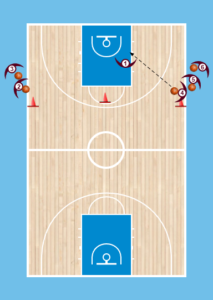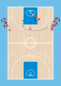Toποθετούμε τους παίκτες όπως στο πρωταρχικό σχήμα(επάνω 1η φώτο).Εχουμε 3 κώνους και 5 μπάλες.Ο πρώτος παίκτης απο την μία μεριά(όποια θέλετε) δεν έχει μπάλα ενώ όλοι οι άλλοι έχουν.Εδώ θέλουμε ο παίκτης που δεν έχει μπάλα, να τρέξει γύρω απο τον κώνο και να κόψει προς το καλάθι.Στην συνέχεια παίρνει πάσα απο την μεριά που έχουν την μπάλα οι παίκτες(απο τον 1ο παίκτη) και τελείωνει με μπάσιμο.Στην συνέχεια ο παίκτης που έδωσε πάσα απο την μεριά με τις μπάλες στον παίκτη που έκοψε και έκανε μπάασιμο κάνει το ίδιο απο την αντίθετη μεριά και τελειώνει δηλαδή και αυτός γύρω απο τον κώνο με μπάσιμο και ούτω καθεξής.